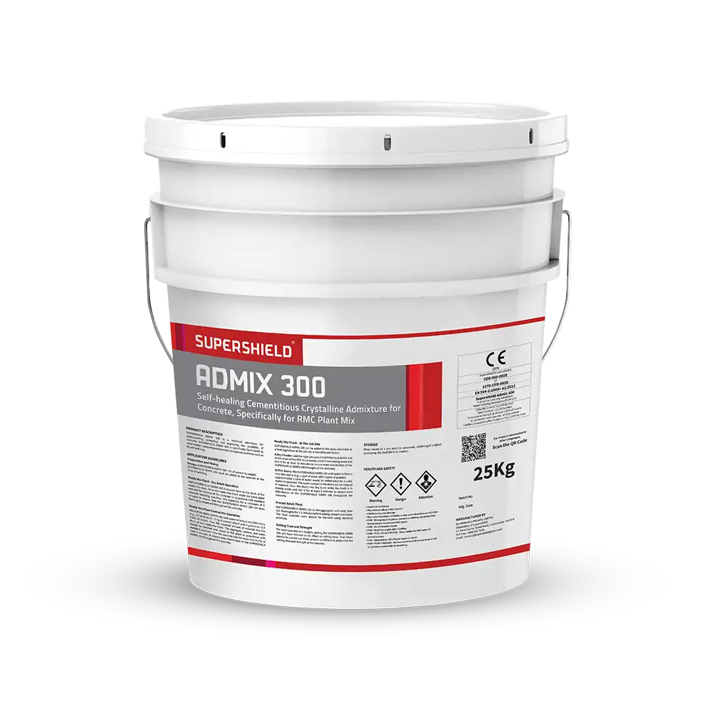 SUPERSHIELD ADMIX 300 is a chemical admixture for waterproofing, protecting and improving the durability of concrete. The proprietary blend of chemicals in SUPERSHIELD ADMIX 300 reacts with the moisture and the by products of cement hydration to form a highly resistant crystalline formation that becomes an integral part of the concrete and acts as an impermeable barrier against water and other chemicals. Thus the concrete becomes permanently sealed against penetration of water and other chemicals from any direction. This crystalline structure occurs where moisture is present, so later if cracks form due to settling or shrinkage the incoming water triggers the crystallization process and additional crystals begin to grow. SUPERSHIELD ADMIX 300 is specially designed for waterproofing concrete with self-healing properties, this admixture is specifically formulated for ready-mix concrete (RMC) plant mixes and is ideal for projects requiring extended retardation.