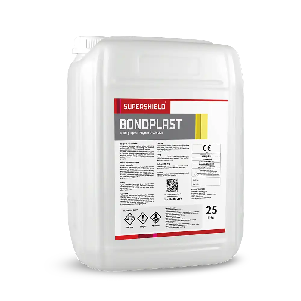 SUPERSHIELD BONDPLAST is a Multipurpose high solids, polymer dispersion, specially designed for fortifying Portland cement compositions, used in primer waterproofing coating, waterproofing plastering, anticorrosive coating, Industrial flooring, Tile adhesives and in repair mortars. SUPERSHIELD BONDPLAST improves curing qualities, enhances bond and strength, Imparts excellent water and weather resistance, and reduces shrinkage cracking.