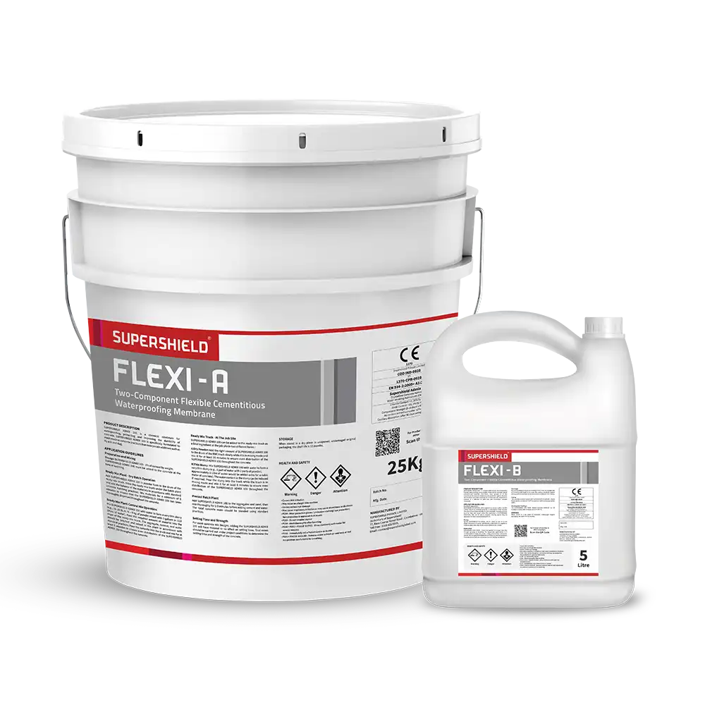 SUPERSHIELD FLEXI is a two-component, flexible cementitious waterproofing membrane consisting of a specialized liquid polymer dispersion and a cementitious powder. These components are mixed just before application. SUPERSHIELD FLEXI is suitable for areas of potential cracking. The initial and final bonding ability of SUPERSHIELD FLEXI is excellent, making it suitable to be applied on horizontal as well as vertical surfaces. It is durable, resistant to frost and UV after setting and at the same time vapor permeable. SUPERSHIELD FLEXI is an active barrier to carbon dioxide (CO2). This will ensure that all crevices and fine cracks are all sealed and waterproofed. SUPERSHIELD FLEXI is not a decorative material. SUPERSHIELD FLEXI is applied to surfaces such as concrete, masonry, and render which have to be sealed and protected against the influence of water and moisture. Owing to its elastic properties, it is used in zones posing cracking or deforming problems. SUPERSHIELD FLEXI is tested for use in drinking water reservoirs.