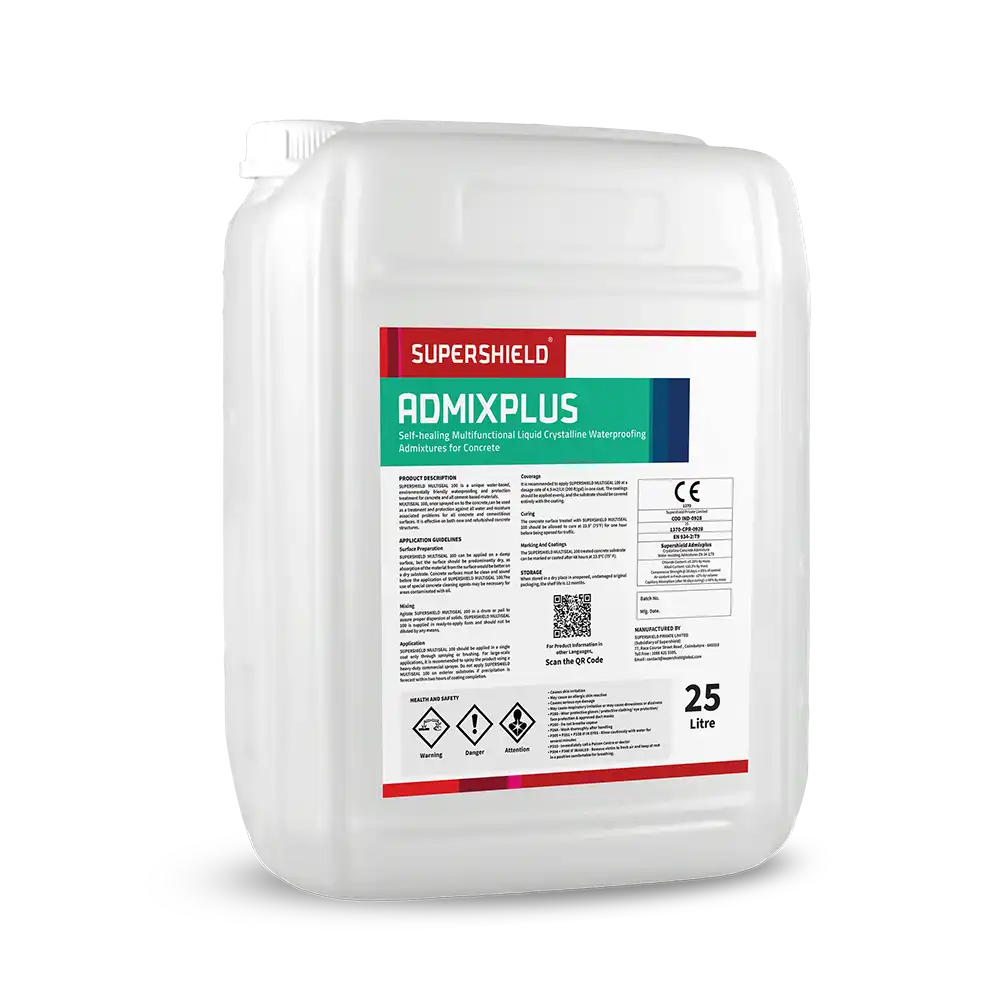 ADMIXPLUS is a high-performance liquid crystalline admixture powered by Dynamic Multifunctional Crystalline (DMC) Technology, developed to enhance the resilience and durability of concrete from casting through its entire service life. Once added to the mix, the technology activates adaptive SHIELD Crystals that seal pores and capillaries, regulate hydration, and balance heat generation during curing. This ensures optimal moisture retention, prevents rapid drying in hot climates, protects against freezing in cold conditions, and minimizes thermal stress and shrinkage cracks.
