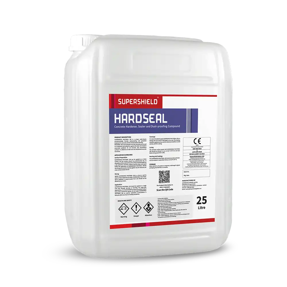Supershield HARDSEAL is a concrete hardner, sealer and dustproofing compound based on salts from the catalyzed inorganic chemistry. Supershield Hardseal is a single component ready to use, transparent, chemically reactive water based sealer that penetrates concrete and other masonry building materials to protect, preserve and strengthen them permanently by curing, sealing, hardening, dustproofing, neutralizing alkali and increasing bonding on the subsequent coatings. It is non-toxic and contains no volatile organic compound.