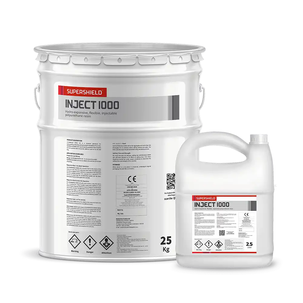 SUPERSHIELD INJECT 1000 is a semi-flexible polyurethane resin that expands to approximately ten times its initial volume. This solvent-free resin is ideal for sealing both small and large water leaks in concrete or solid masonry through injection. It is also perfect for filling and sealing small cavities, joints, and discontinuities that are subject to movement. In contact with water, SUPERSHIELD INJECT 1000 forms a flexible polyurethane foam. Technically, it is a mono-component product which reacts spontaneously with the water present in the masonry to be sealed. The speed of reaction with just water, however, would be very slow relative to the construction site requirements. It is therefore essential to use an expansion accelerator, sold in combination with the same resin (component B). The polyurethane foam resulting from injection operations, will keep its volume stable once expanded. A good resistance to hydraulic pressure in the water flow after about 1-2 minutes from the time the reaction took place. The formation of CO₂, typical of the polyurethane reaction, will further pressurize the system, thus favoring the penetration of the resin in the cracks and cavities. In a free environment, SUPERSHIELD INJECT 1000 expands to about 10 times its initial volume.